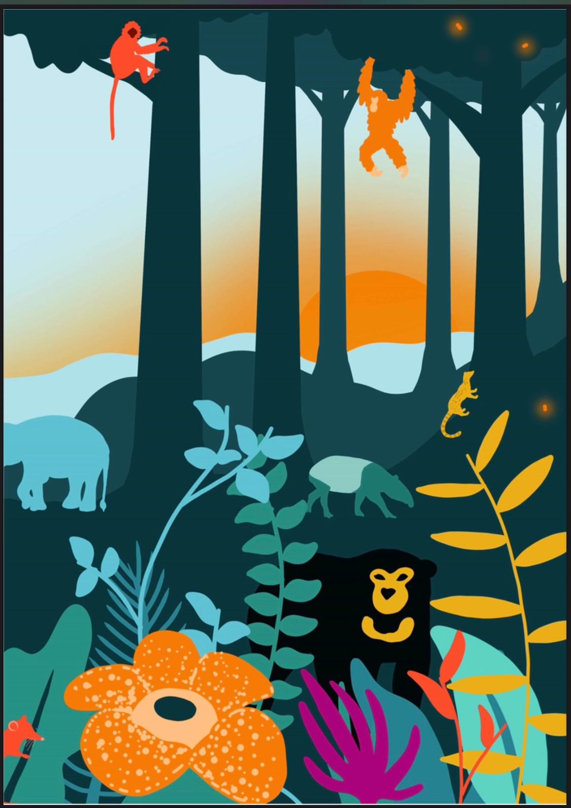 Michelle Desilets of Orangutan Land Trust was also a source of inspiration, helping to not only name The Rimba, but also advising on content , as well as helping with the editing and Mark Harrison from Borneo Nature Foundation told me about a wonderful artist and orangutan researcher, Emma Lokuciejewski. After a couple of phone calls, she was in and the beautiful artwork of The Rimba was created.
