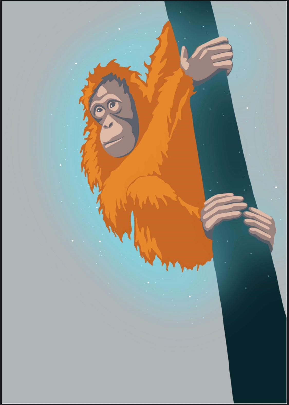 Using it as my inspiration, I wove a story around an elderly female orangutan becoming the spiritual guardian of the rainforest – a mystical protective being that teaches, advises and cares.