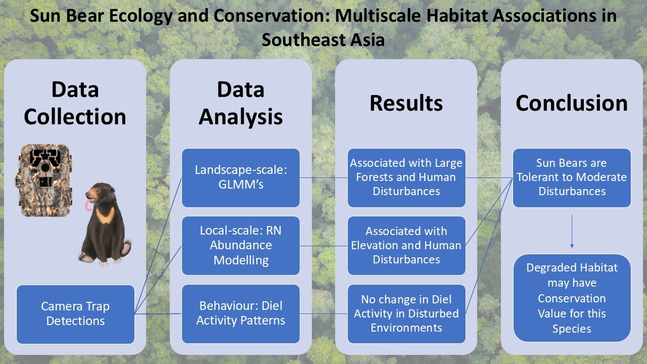 In a recent study published in the journal Integrative Conservation, my colleagues in the Ecological Cascades Lab at the University of Queensland and I examined multiscale habitat association of the sun bear across its range. We compiled camera trap detections of sun bears from both new and previously published studies and assessed how the number of detections changed in relation to habitat covariates such as forest size, human population, and extent of oil palm plantations. We found that sun bears were most regularly detected in large forests, but also in forests that neighbour humans and their infrastructure. These findings support earlier studies that found that sun bears require large intact forests, but also suggest that they are perhaps more resilient than previously realised and can persist in somewhat degraded habitat. A possible explanation for this adaptability is the sun bear’s dietary flexibility and its ability to shift to an insectivorous diet in degraded habitat.
